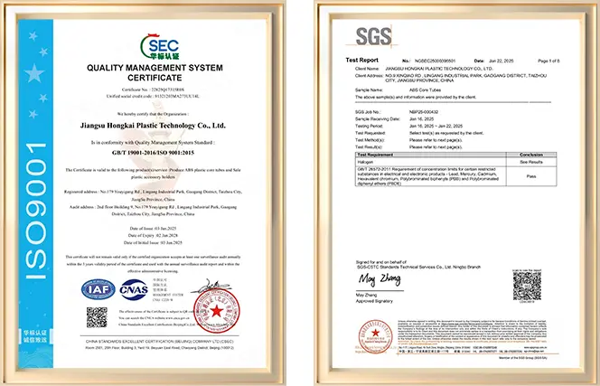 We have specialized in the ABS plastic core tube industry for many years, possessing extensive experience in product manufacturing and innovation, We currently have five extruders and eight injection molding machines, ensuring sufficient production capacity. and holding certifications such as ISO9001 and RoHS,Ensures product quality.