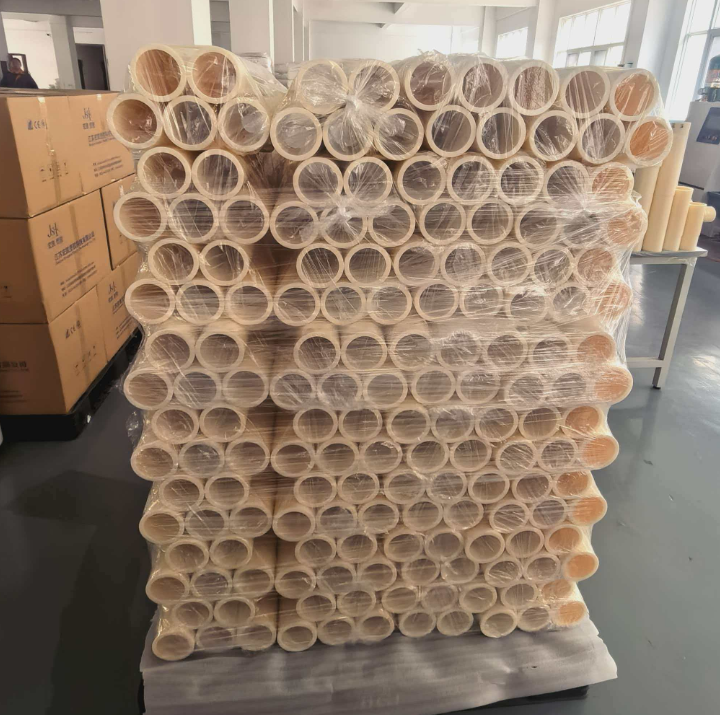 We have comprehensively optimized the packaging design for this batch of ABS core tubes to ensure transportation safety and product protection. Each shipment employs standardized palletized packaging: tubes are first encased in high-strength transparent dust-proof bags to effectively prevent dust and moisture ingress; then reinforced with multiple layers of food-grade cling film to enhance impact resistance and moisture protection; The outermost layer features custom corrugated cardboard boxes tightly encasing the goods, secured with green strapping bands to guarantee a stable and reliable overall packaging structure. As illustrated, the packaged goods are stacked neatly with sharp edges, fully demonstrating our professionalism and meticulousness in logistics protection.